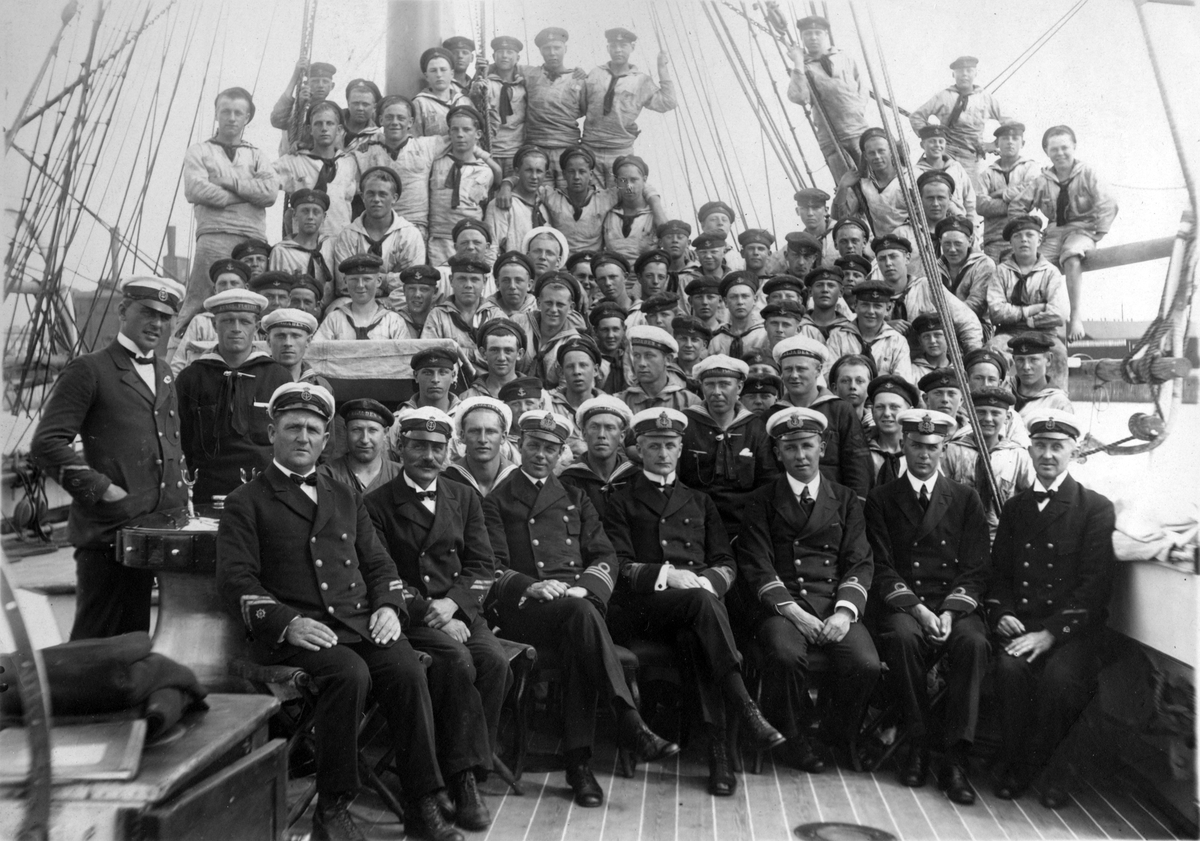 Titel: Najdens besättning i gruppfotografi på fartygs däck. Befälen sitter ned på främre raden.