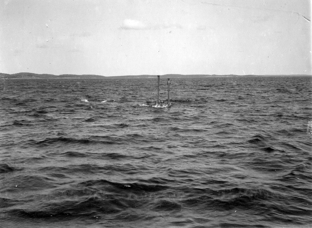 Ubåt intill ytan, endast periskop och del av luckan sticker upp. (Ubåtsskolan 1911)