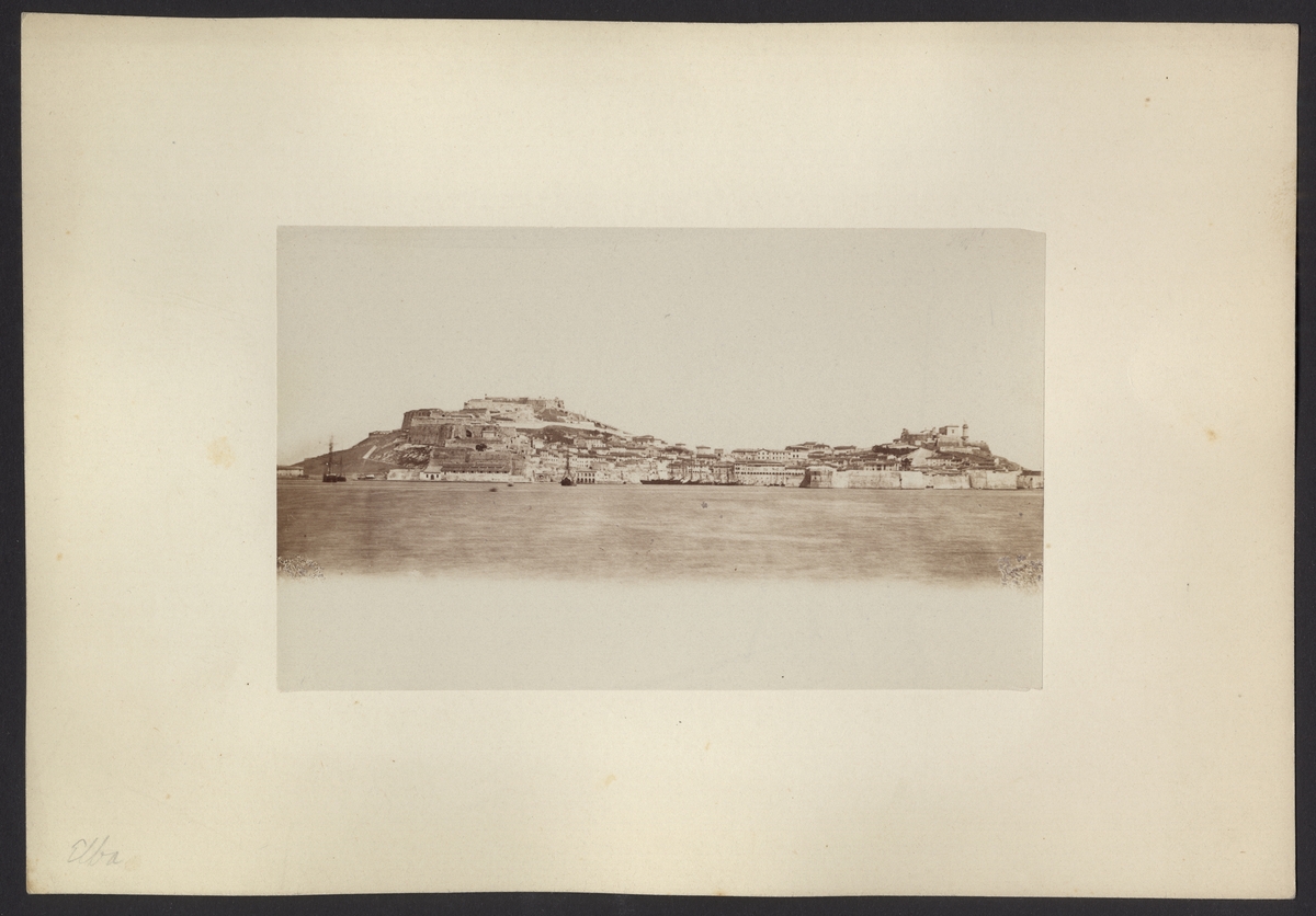 Bilden föreställer en vy över gamla stan av Portoferraio på Elba. Staden sträcker sig över två kullar intill en havsvik.