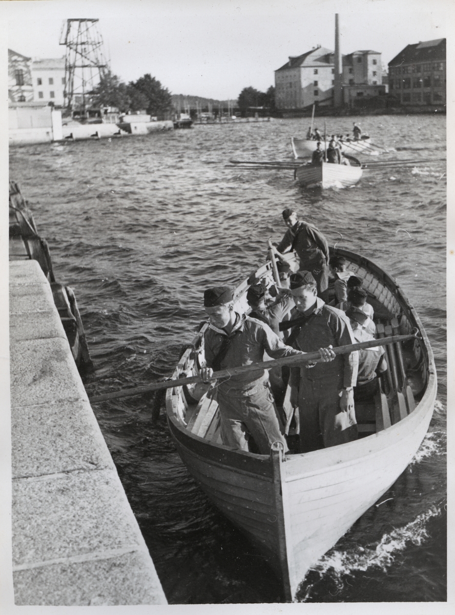 I bilden ses tre slupar med roende besättningar. Båten i förgrunden ligger fortfarande nära kajen och en matros skjuter ifrån med en båtshake. Bredvid honom står en kamrat och tittar på. Bakom de båda sitter resten av besättningen. Alla har har sjömanskläder samt sjömanskragar och mössa. I mellangrunden ses två andra båtar som också ros av sina besättningar. I bakgrunden ses matinrättningen vid Sparregården samt delar av Stumholmen; i detta fall beklädnadsförrådet och beklädnadsverkstaden. Scenen utspelar sig vid Kungsbron.