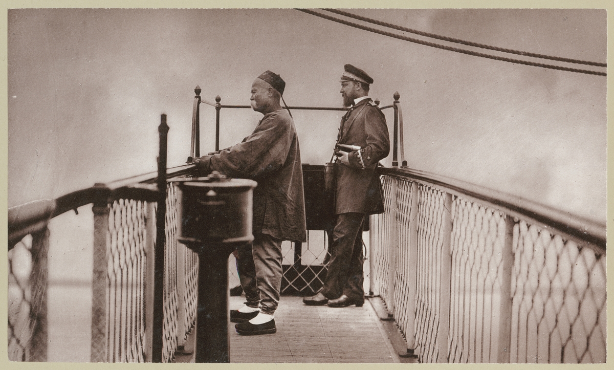 Bilden visar vakthavande officerare och en kinesisk lots på bryggan av den tyska korvetten Stosch.