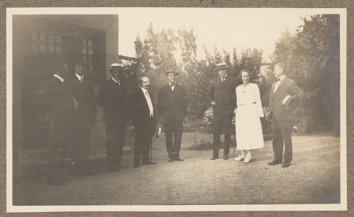 Titel: En grupp finklädda män och kvinnor har tagit uppställning för ett gruppfoto.