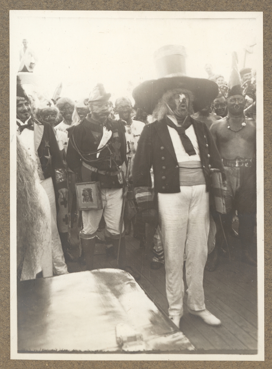 Bilden visar antagligen skrivaren som förrättar upprop under linjedopet ombord på Fylgia. Han har en kladda under armen och talar till besättningen. Bakom honom ser man resten av Neptuns hovstat.