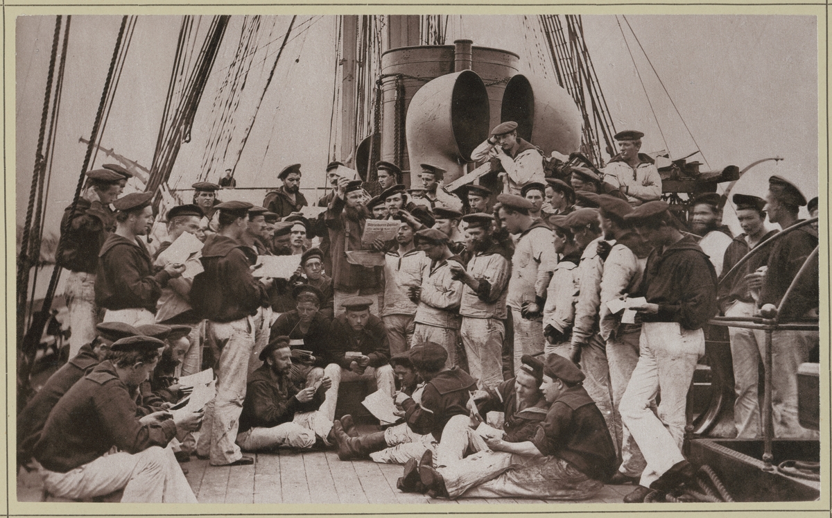 Bilden visar utdelning av post ombord på korvetten Stosch. En besättningsmedlem i centrum av bilden är omringat av sina kamrater som väntar med spänning på sin post medan andra som redan har fått den håller på att läsa.