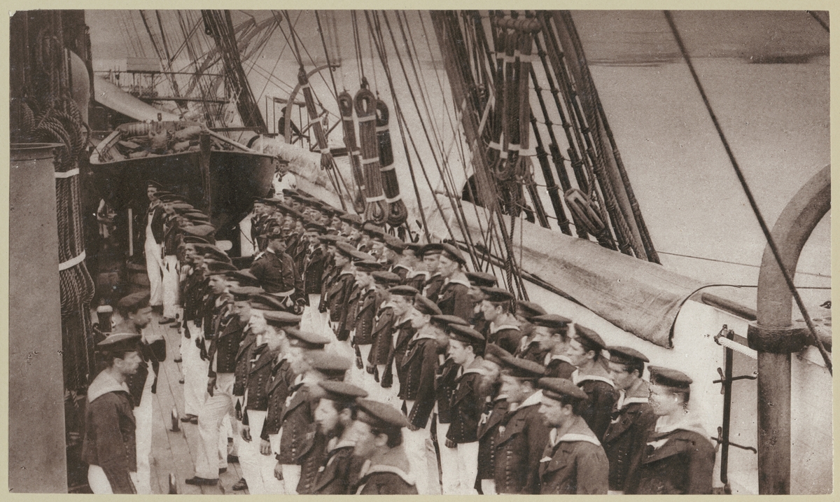 Bilden förställer tyska sjömän ombord på korvetten Stosch som har tagit uppställning för mönstringen som sker varje söndag för att kontrollera den personliga hygienen och städningen i bo utrymmen.