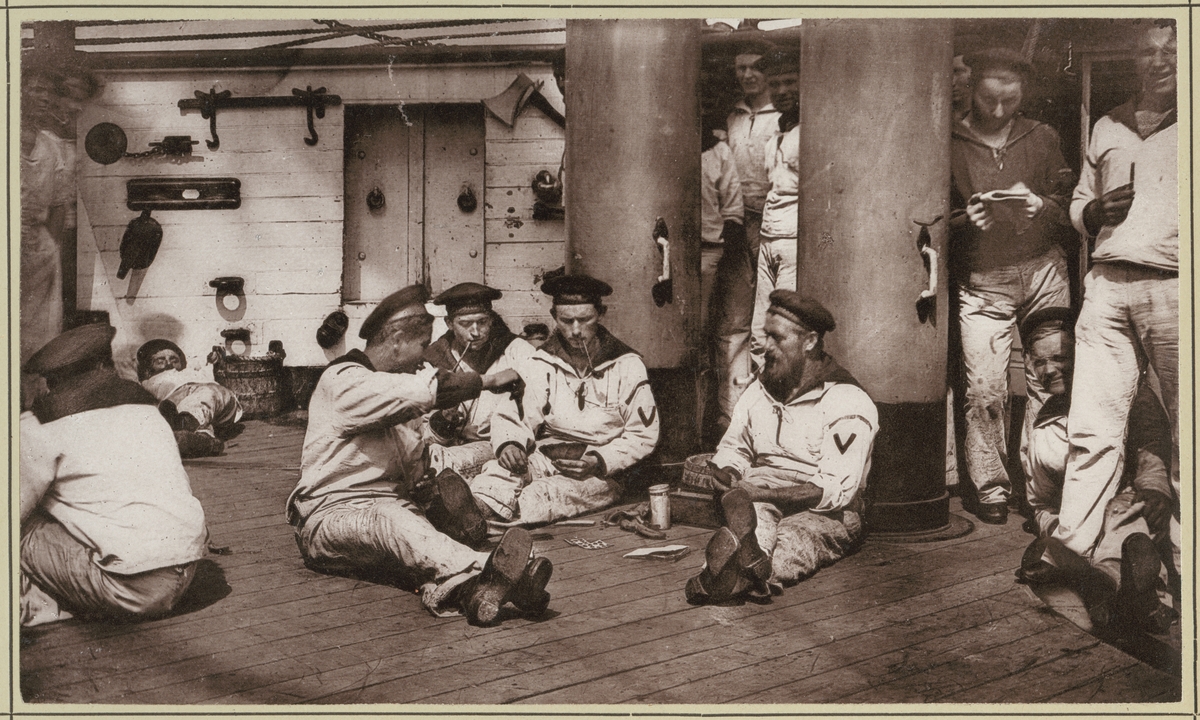 Bilden visar manskapet ombord på korvetten Stosch som njuter av fritiden med kortspel. Här spelas den klassiska tyska kortspelet "Skat".