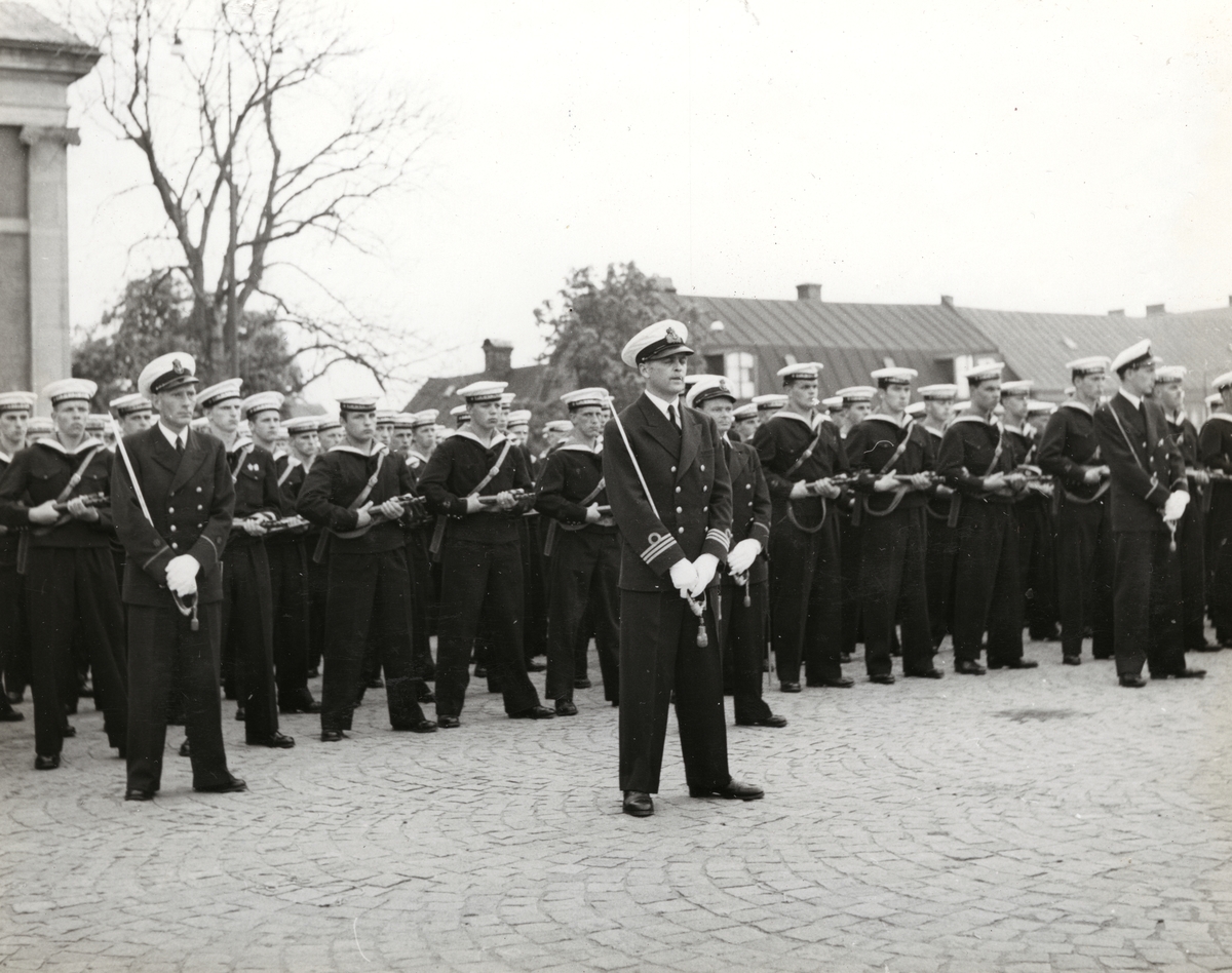 Militärer uppställda i uniform framför Tyska kyrkan på Karlskronas torg. Sjöbefälen står med värjor längst fram.