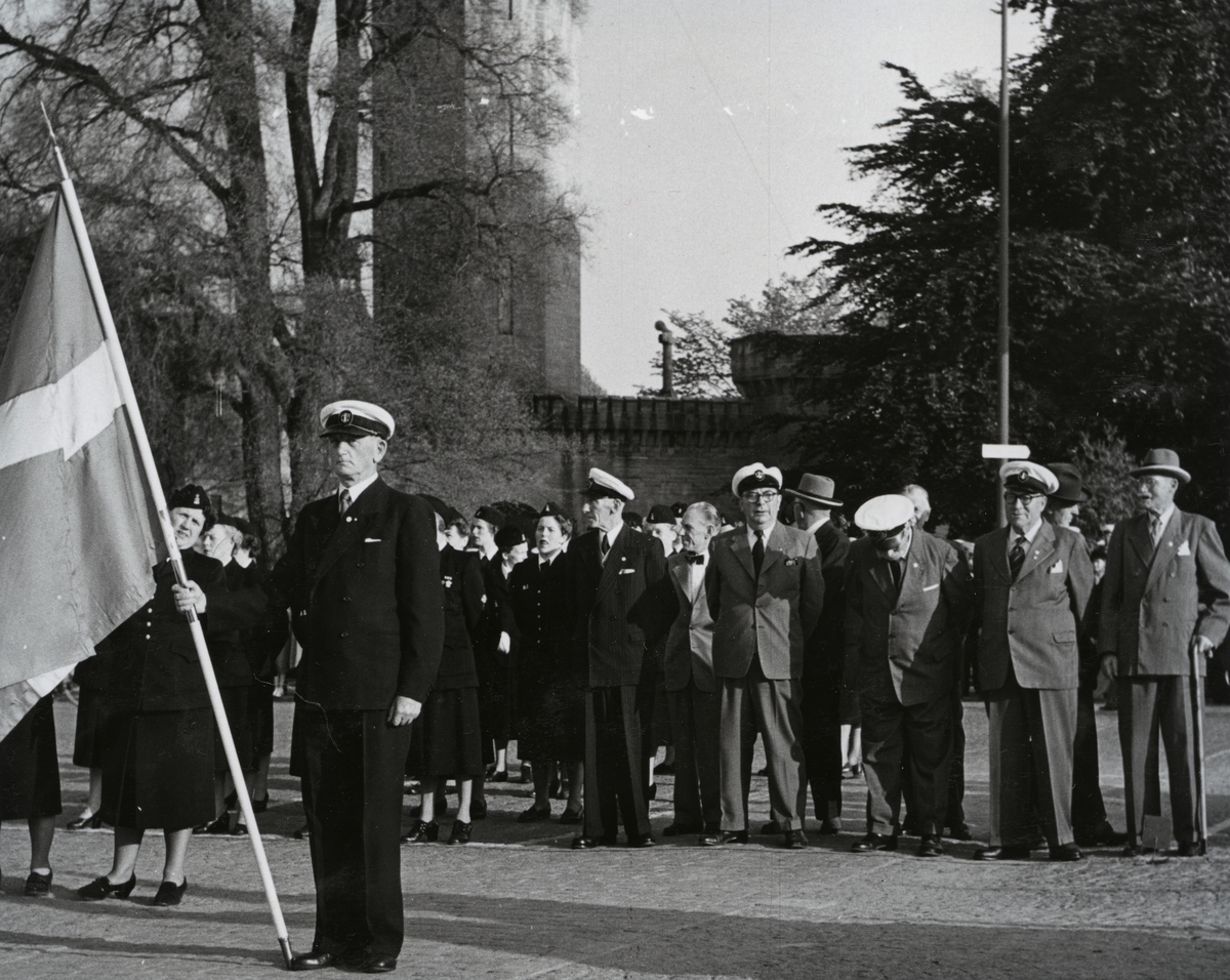 En uniformsklädd man står med en stor svensk flagga i en ände av stortorget närmast vattenborgen. Bakom honom står fler kostymsklädda män med koppling till marinen samt kvinnor ur lottakåren. I Bakgrunden syns träd och vattenborgen.