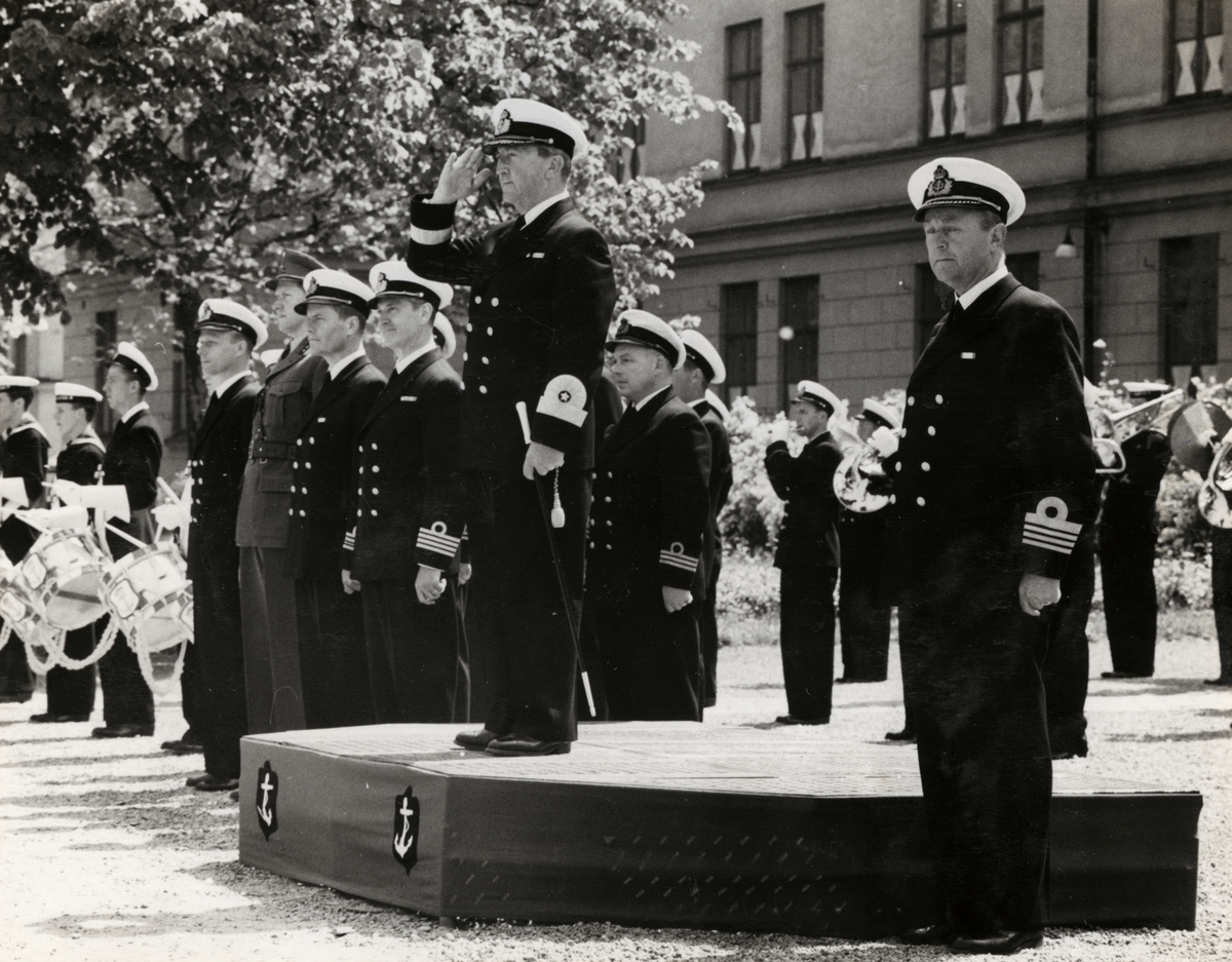 Sjöbefäl gör honör utanför bataljon Trolle tillsammans med andra ur marinen. I bakgrunden spelar marinens musikkår.