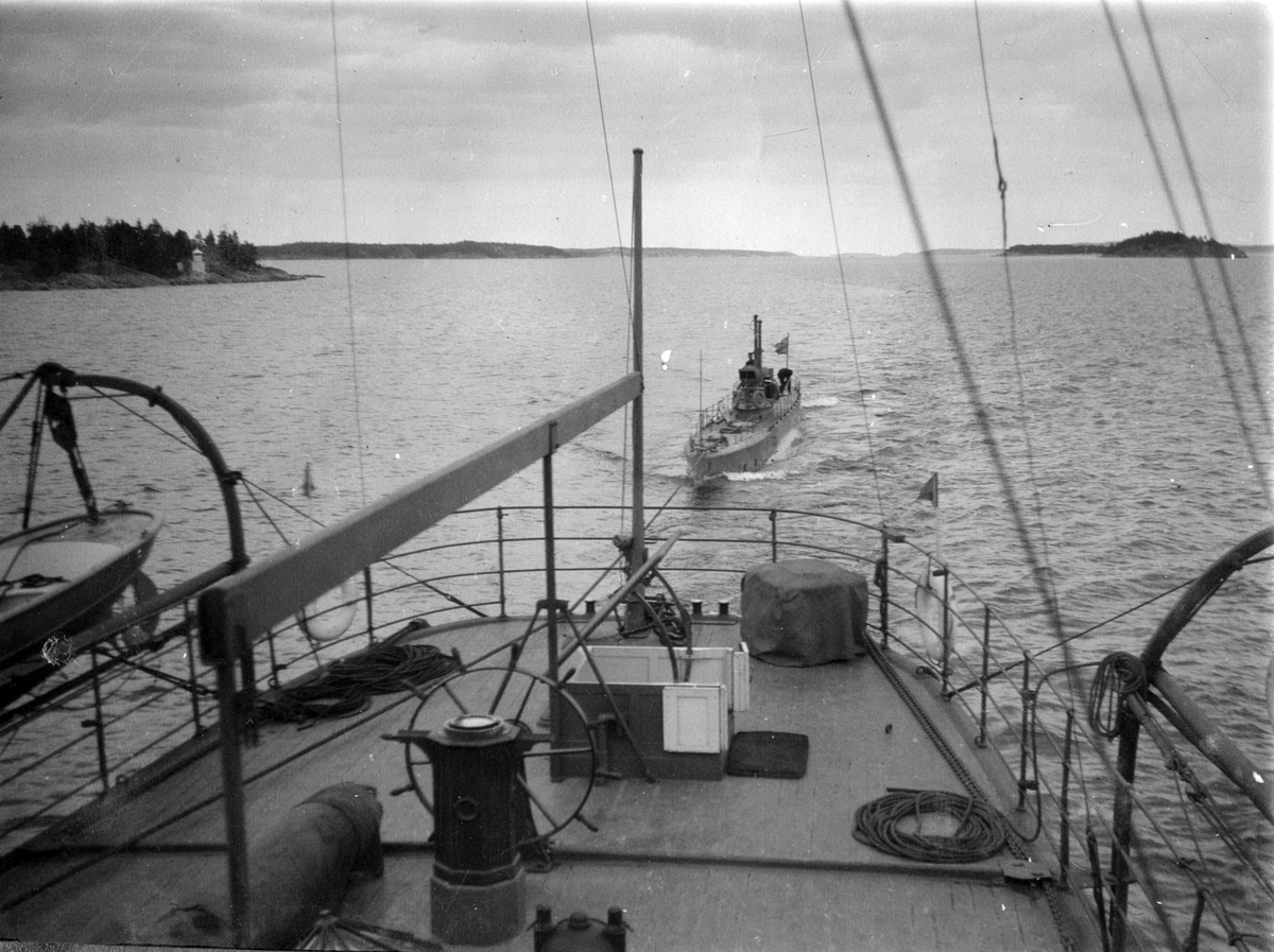 Titel: Vy från akterdäck mot fartyget Blenda till sjöss. I bakgrunden syns kobbar och skär.