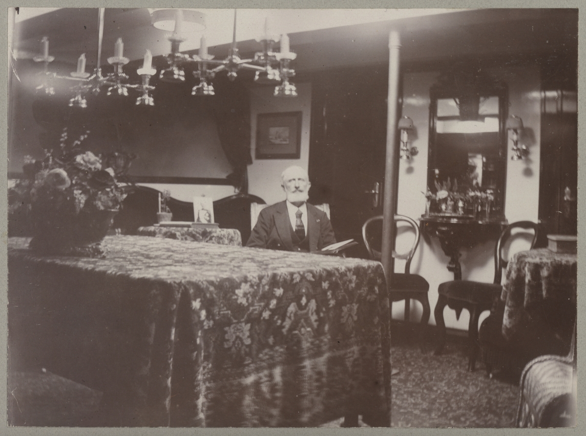 Titel: Rudolf Nissen sitter hemma i sitt vardagsrum och bläddrar i en bok eller fotoalbum.