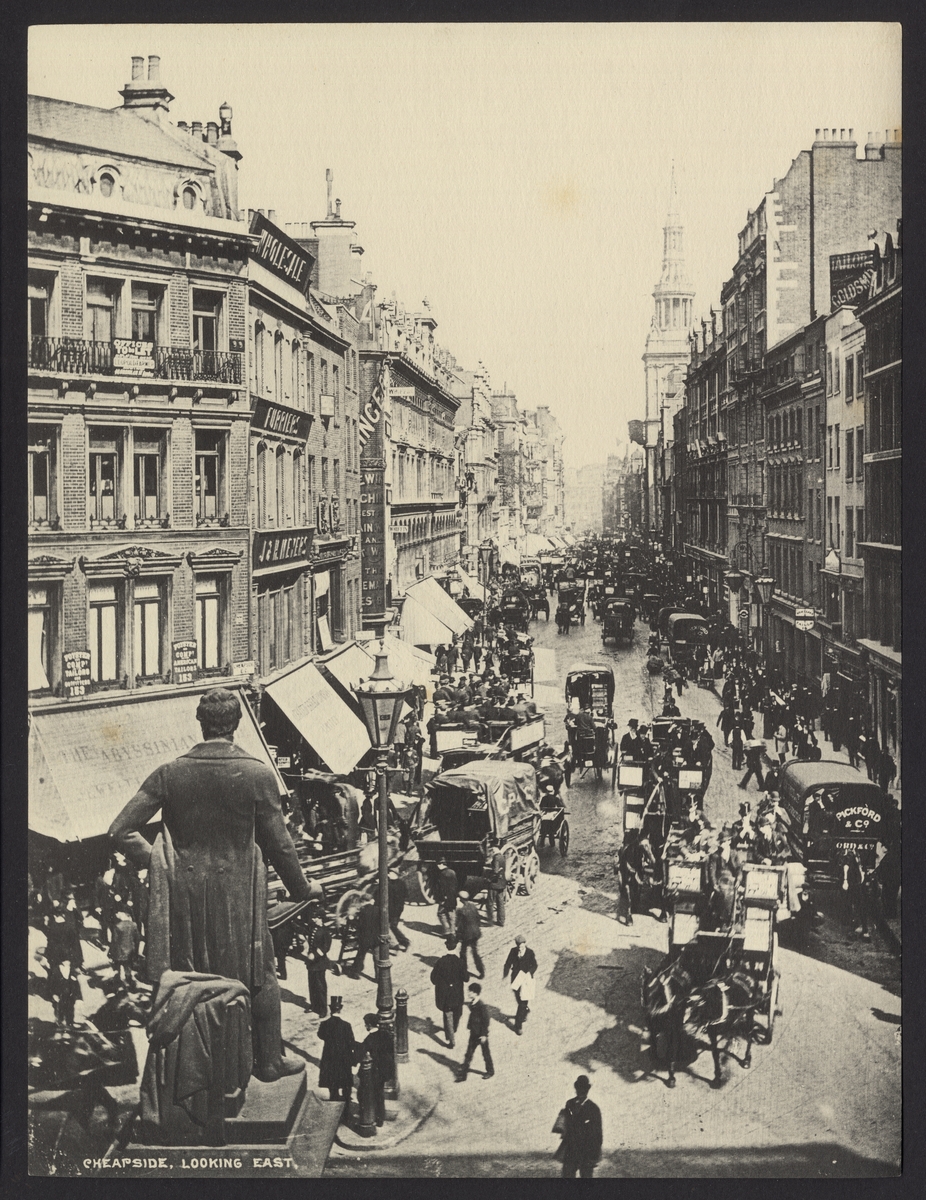 Titel: Bilden visar gatan Cheapside i London med livligt trafik av hästfordon.
