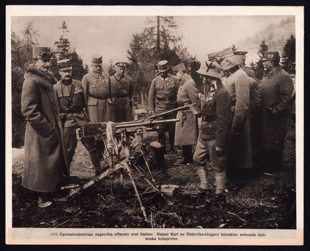 Bilden visar kejsaren av Österrike-Ungern Karl I på ett truppbesök. Han beskådar en kulspruta tillsammans med några soldater och officerare i en bergslandskap.