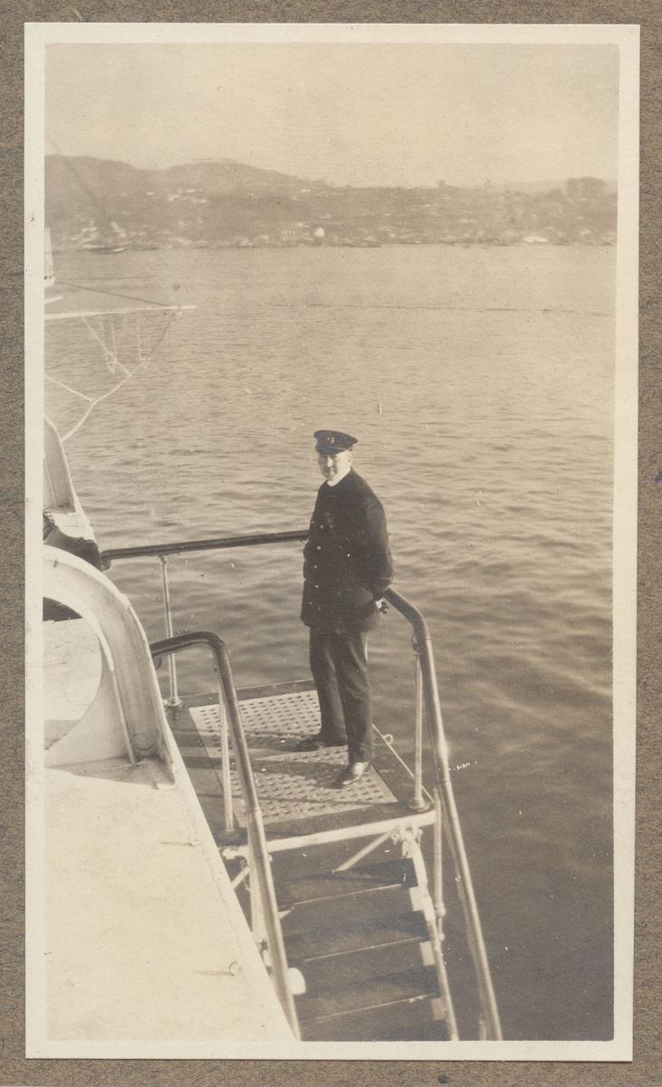 Titel: Fylgias sekond Ebbe von Arbin står på landgången.