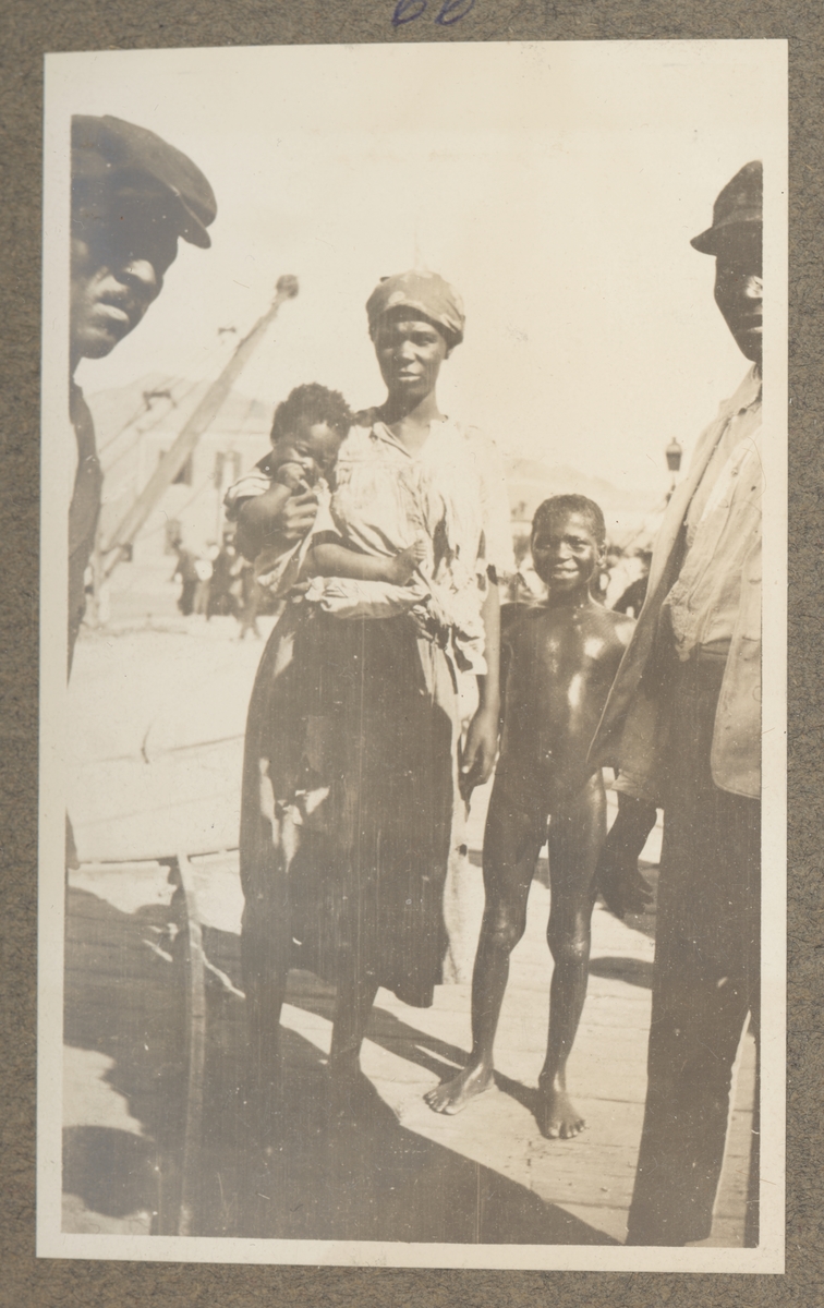 Titel: En svart kvinna bär ett barn i famnen. Bredvid henne står en naken pojke.
