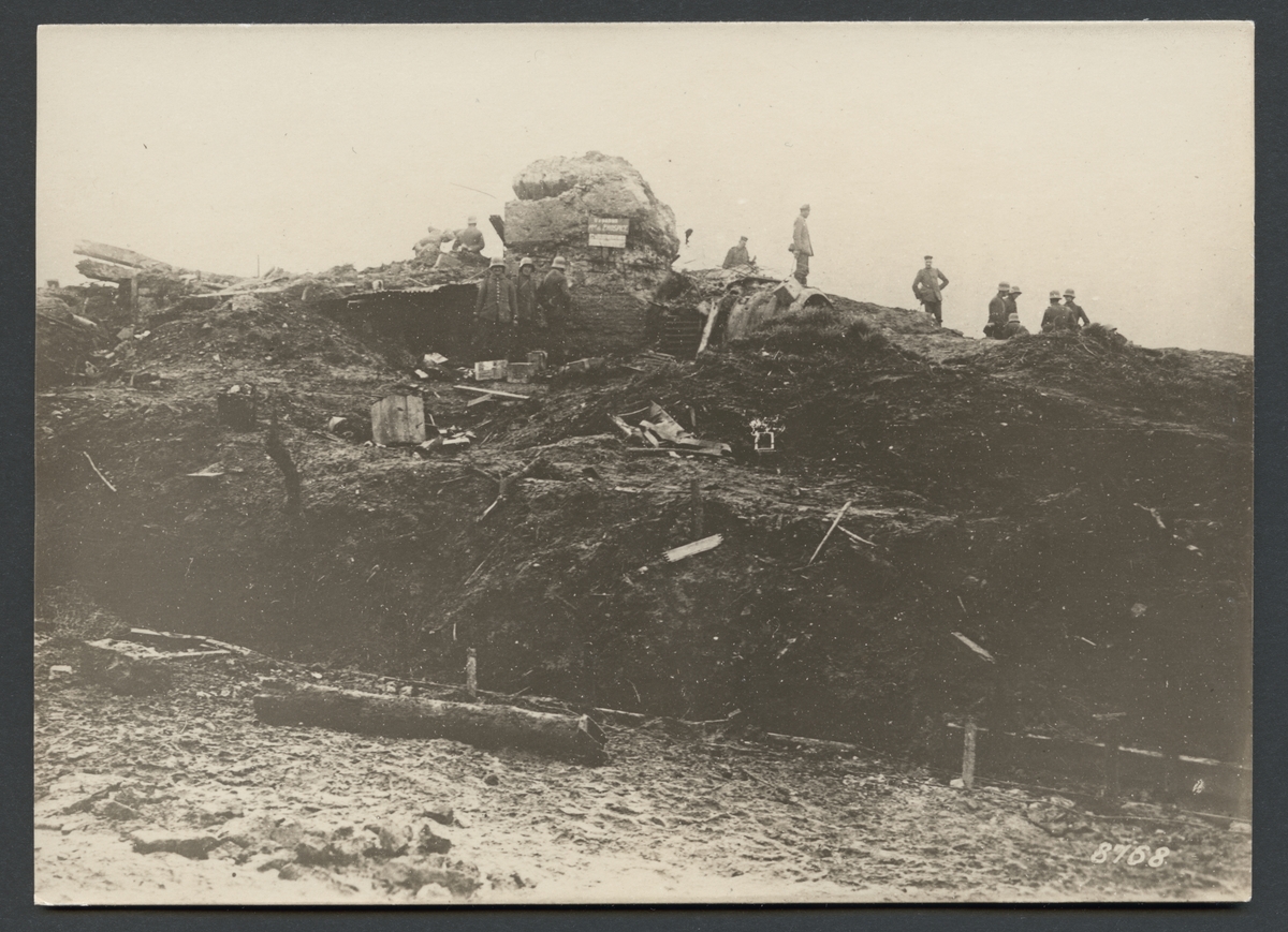 Bilden visar ett slagfält från första världskriget. Området är helt uppgrävt av artillerield och täckt med spillror av krigsmateriel. I bakgrunden syns en sönderskjuten bunker och en grupp soldater som inspekterar området.