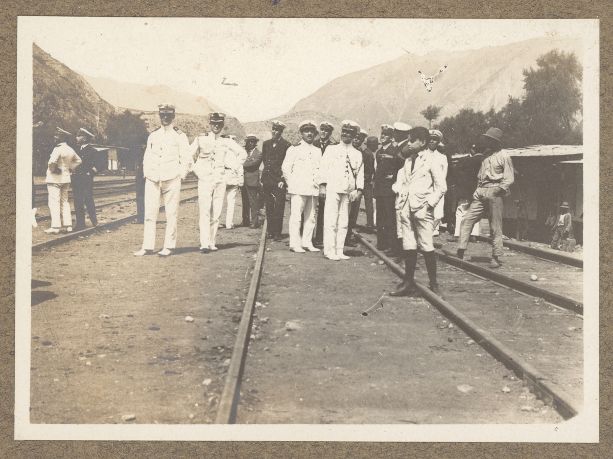 Bilden visar en grupp sjöofficerare i vita och mörka uniformer som står på en järnvägsräls mitt i ett bergslandskap och tittar på omgivningen.