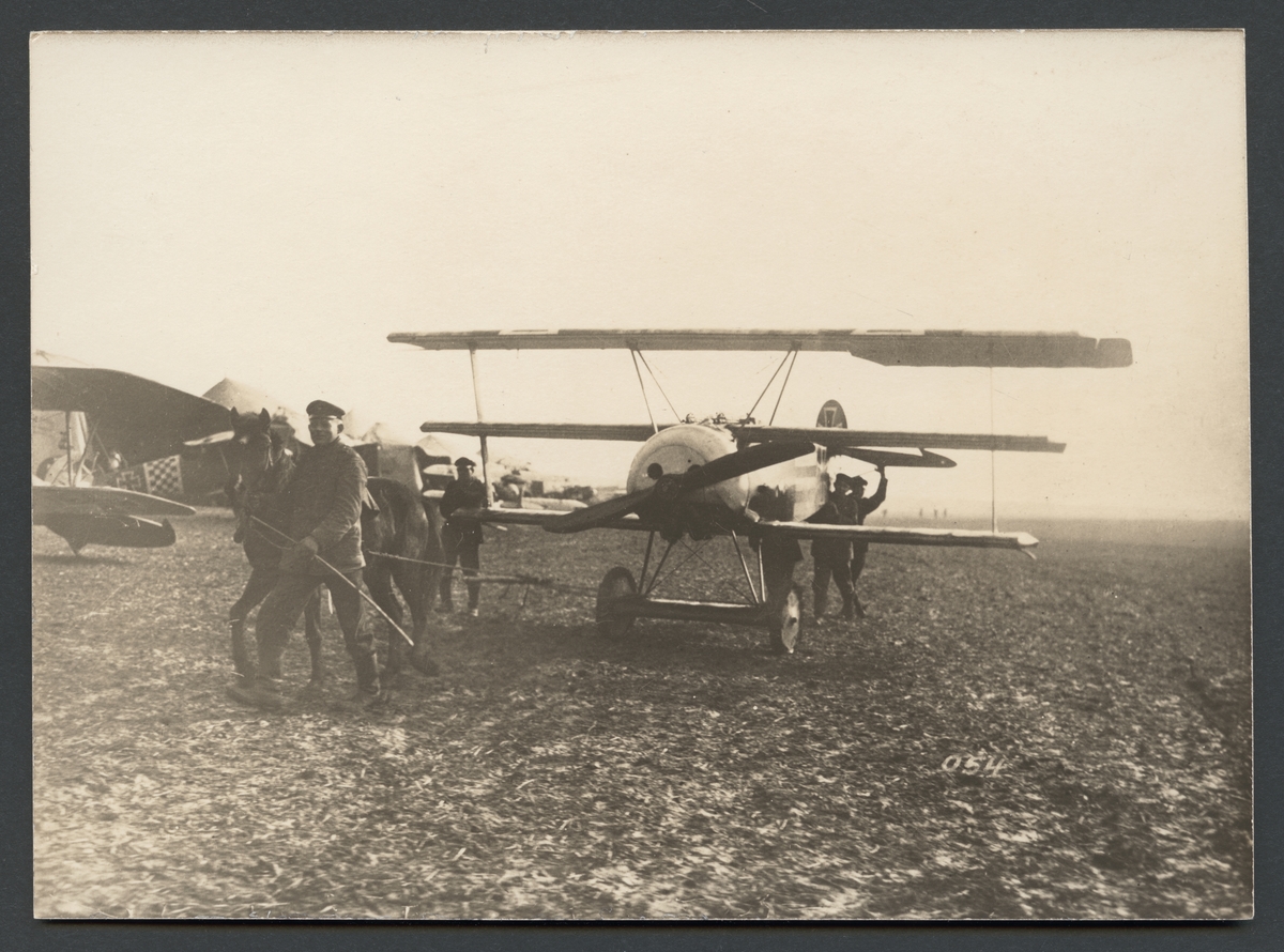 Bilden visar en Fokker Dr. I jaktflygplan som dras till startplatsen med hälp av en häst.
