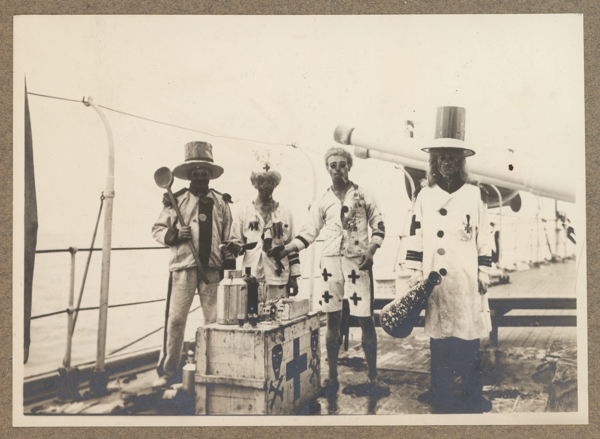 Titel: Bilden visar läkaren och hans medhjälpare ur Neptuns hovstat under linjedopet ombord på Fylgia.