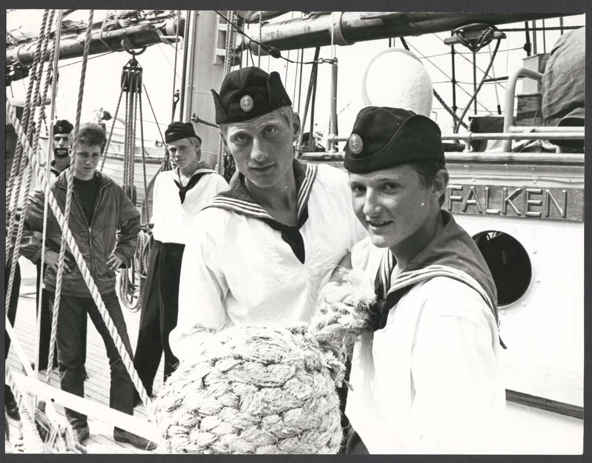 Porträttfotografi av kadetter ombord på skolfartyget Falken. Förgrunden domineras av ett fendert som är flätat av rep.
