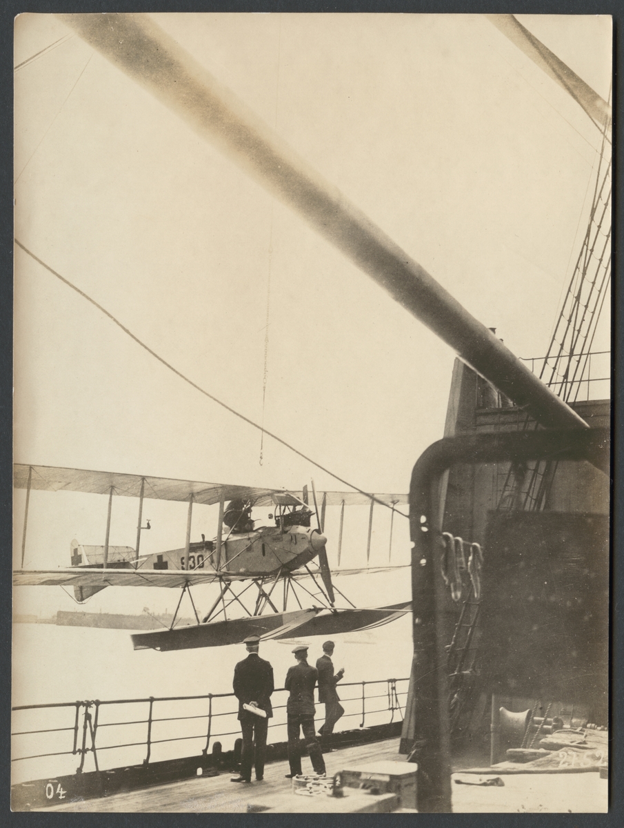 Titel: Bilden visar hur ett sjöflygplan vinschas ner till vattnar från bord av ett fartyg.