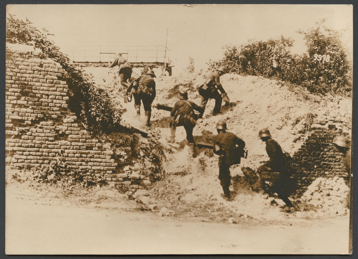 Bilden visar en grupp soldater utrustat med kulsprutor som springer uppför rasmassorna av en byggnad eller tegelvägg.