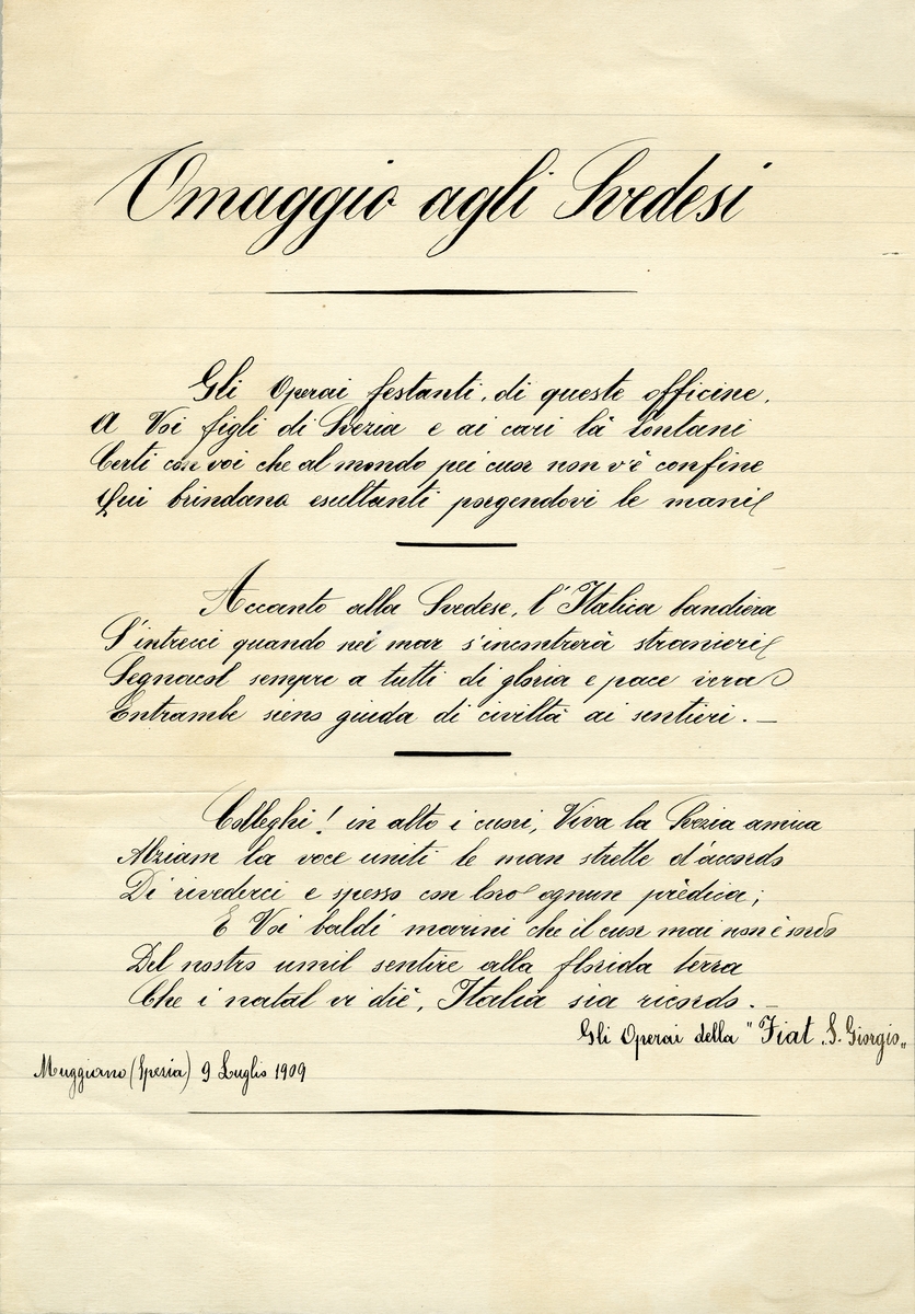 Hyllning till de långväga svenskarna från arbetarna på Fiat-San Giorgio i La Spezia, 9 juli 1909