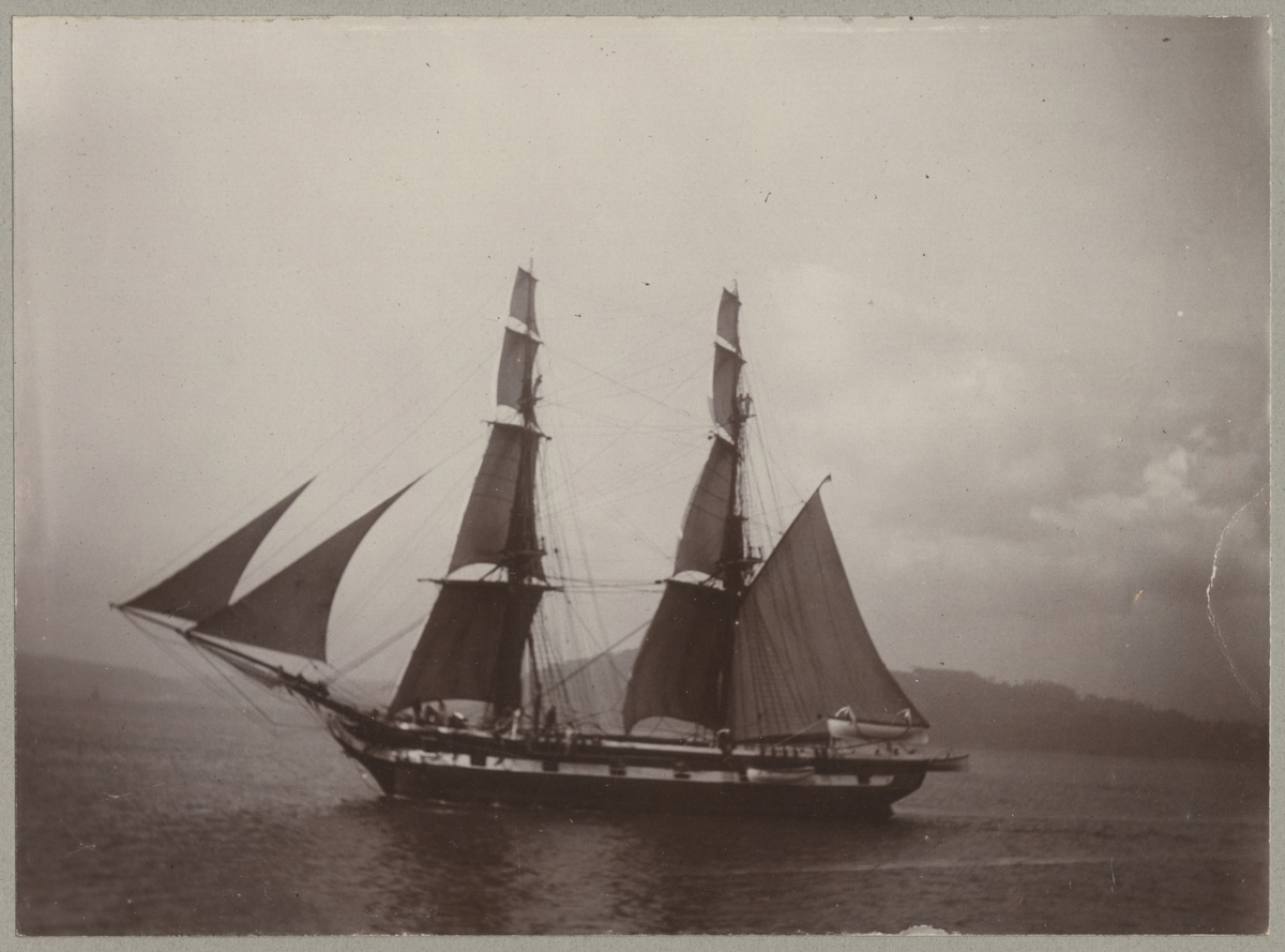 Titel: Bilden visar en brigg seglandes längst kusten.