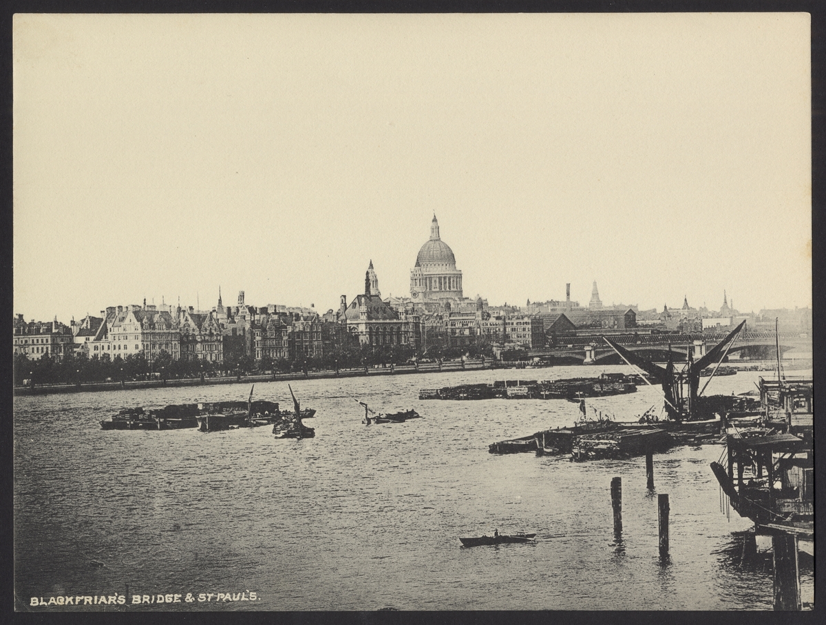 Bilden visar byggnationen av Blackfriars Bridge. Mitt i floden byggs det fundament till den nya bron. I bakgrunden syns City of London och Sankt Paulskatedralens kuppol.