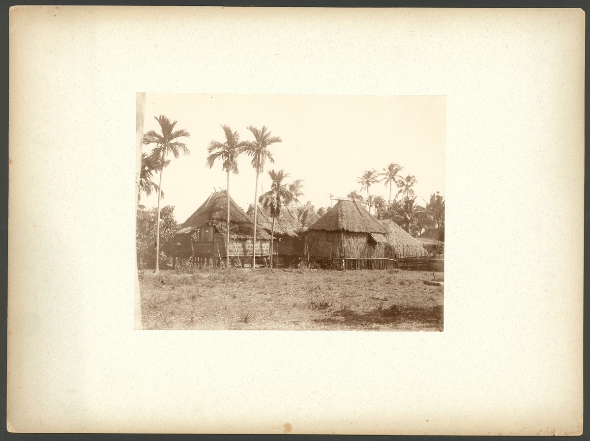 Bilden visar en by med enkla hus av trä och palmblad på Filipinernas största ö Luzon.