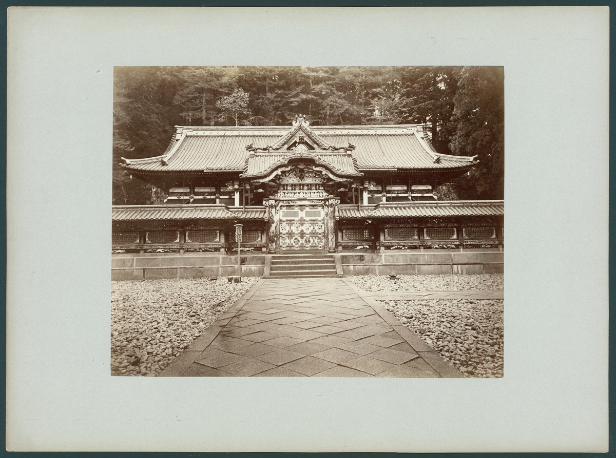 Bilden visar byggnaderna Honden och Karamon som är del av shintohelgedomen Tosho-gu i staden Nikko. Förgrunden utgörs av vägen som genom en låg trappa leder upp till porten Karamon. Bakom den ligger huvudbyggnaden Honden som hyser Futarasans tre gudomar.
