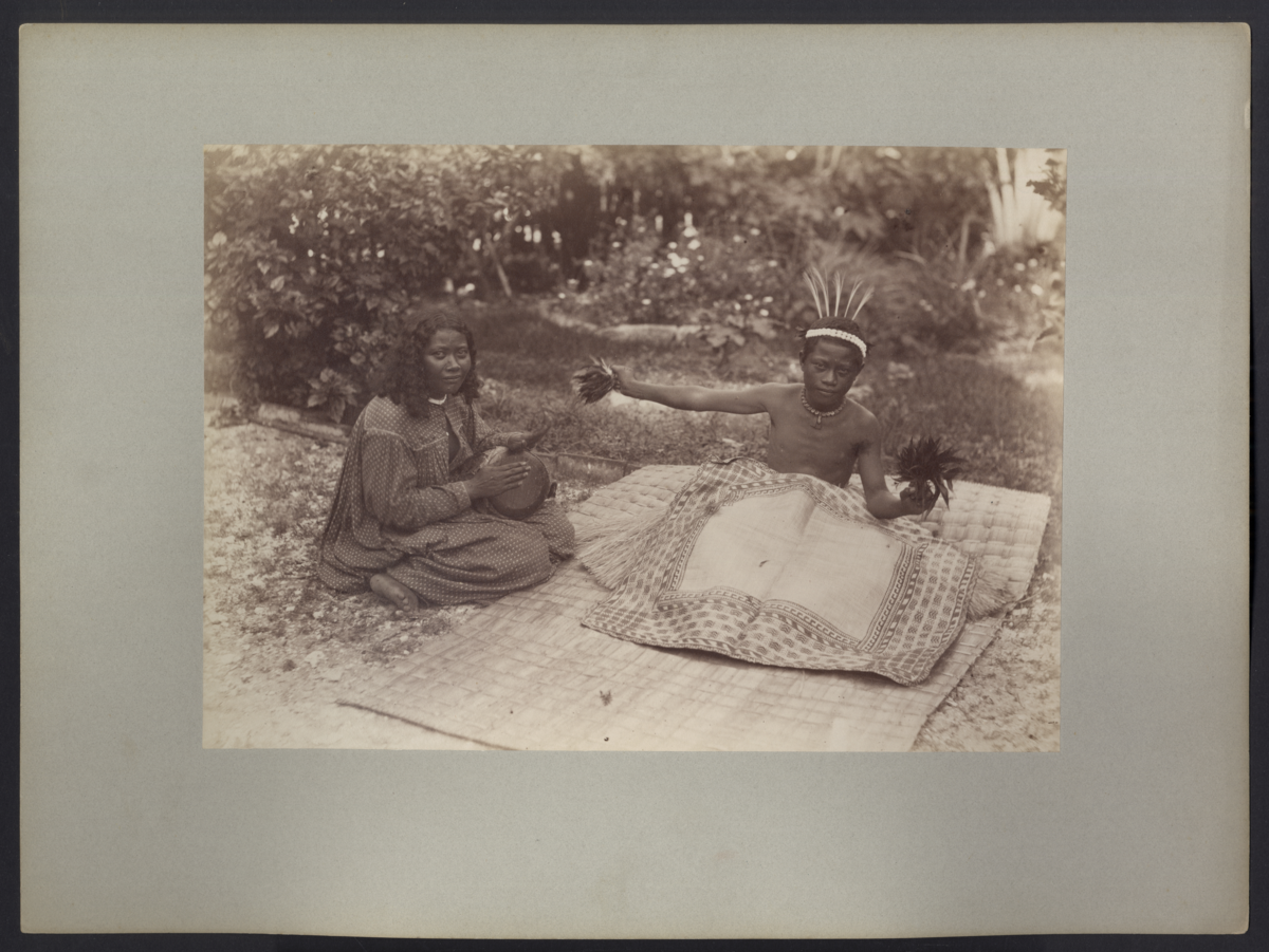 Bilden visar en utriggare som har dragits upp på stranden på Jaluit. I bakgrunden syns en by och en båtbrygga.