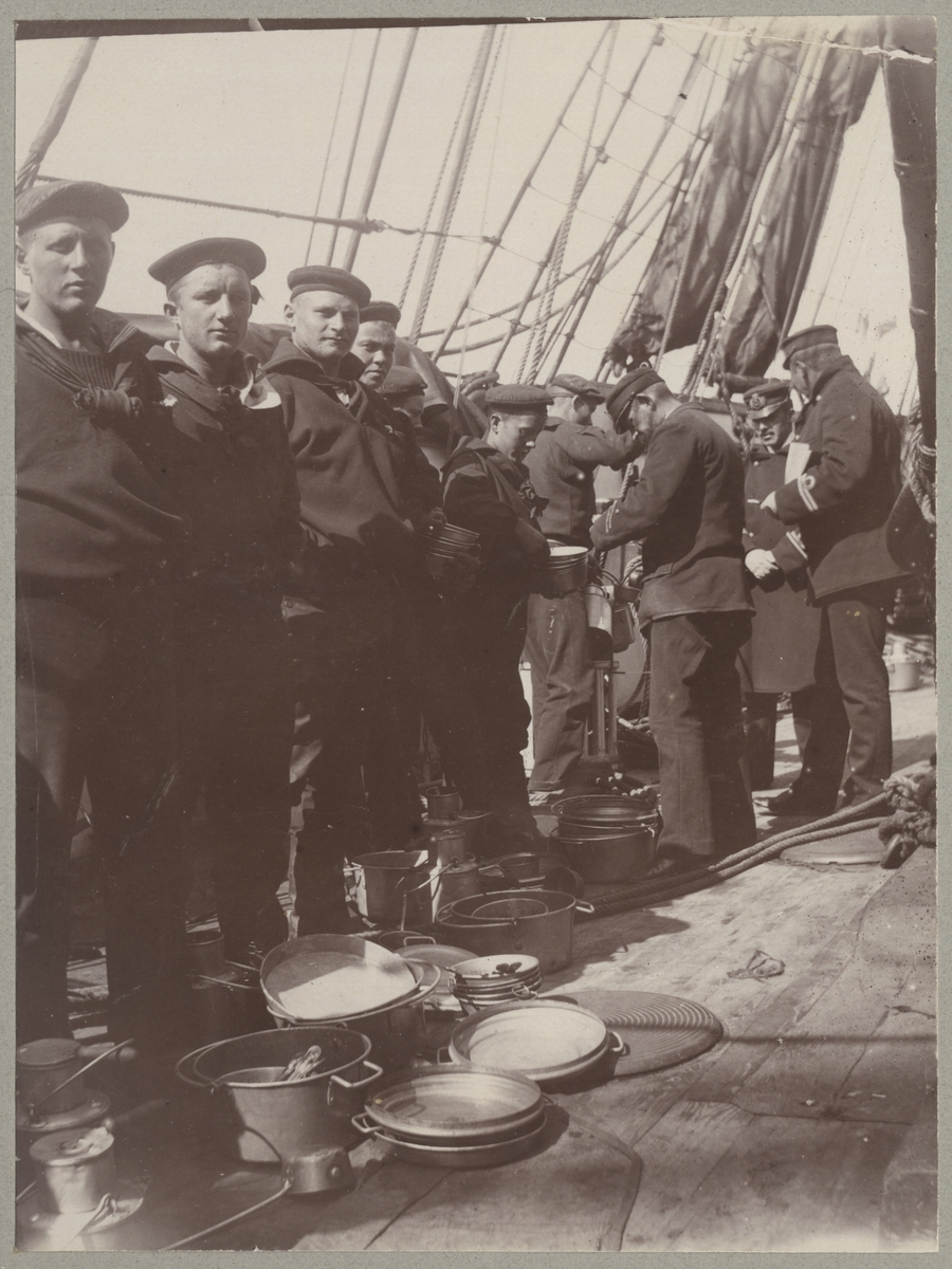 Manskapet har tagit uppställning på däcket tillsammans med rena grytor, tallrikar och annan köksutrutning. Några befäl verka kontrollerar husgerådet som staplats på däcket.