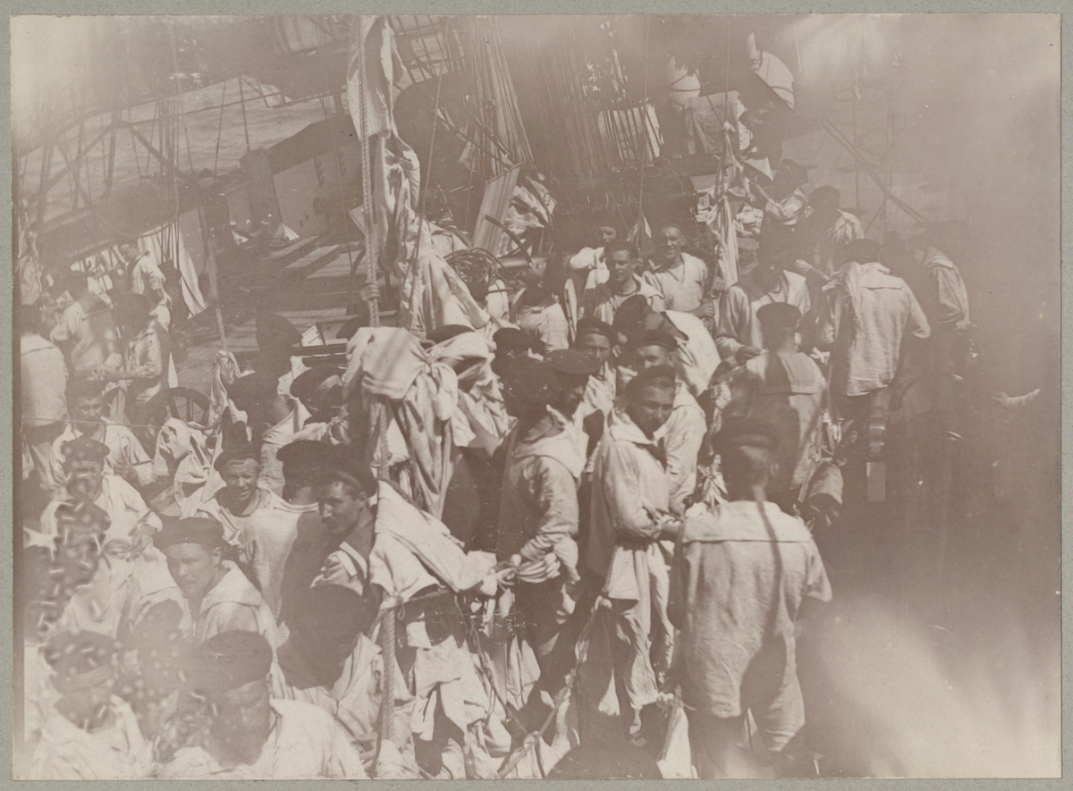 Manskapet på Balder arbetar på däcket. De verkar håller på med tyg, möjligvis lagning av segel eller hängmattor.