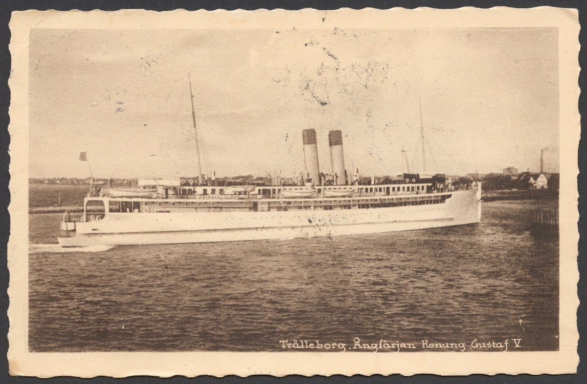 Vykortet visar tågfärjan Konung Gustav V vi inlöpning i Trelleborgs hamn. Fartyget syns från styrbordssidan.