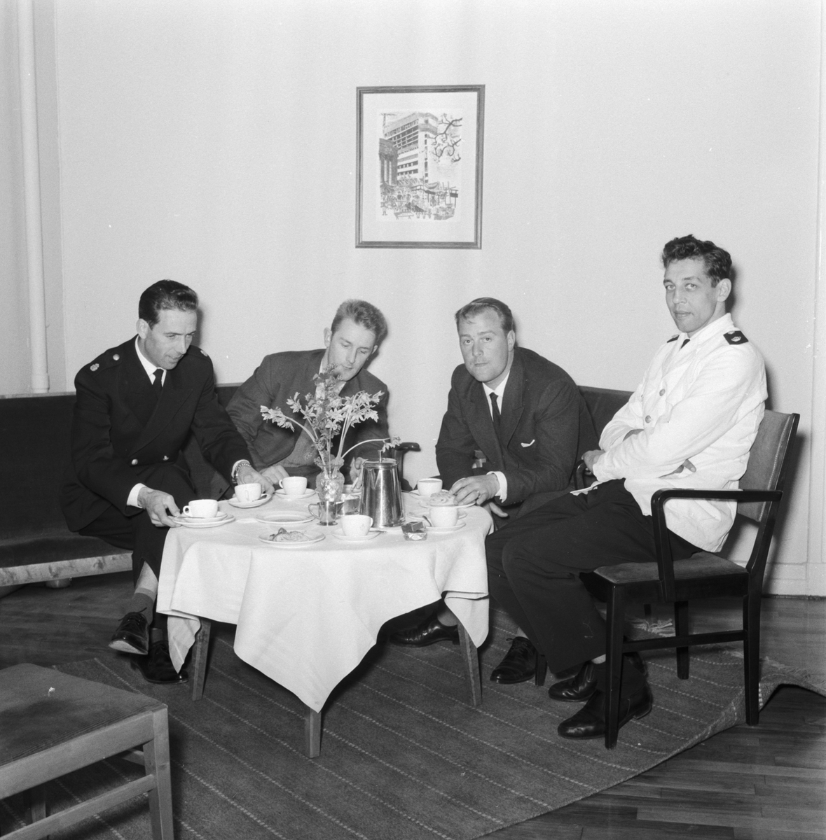 I svart uniform längst till vänster sitter Lennart Skärming och i vit uniform längst till höger sitter Sten Olsson.