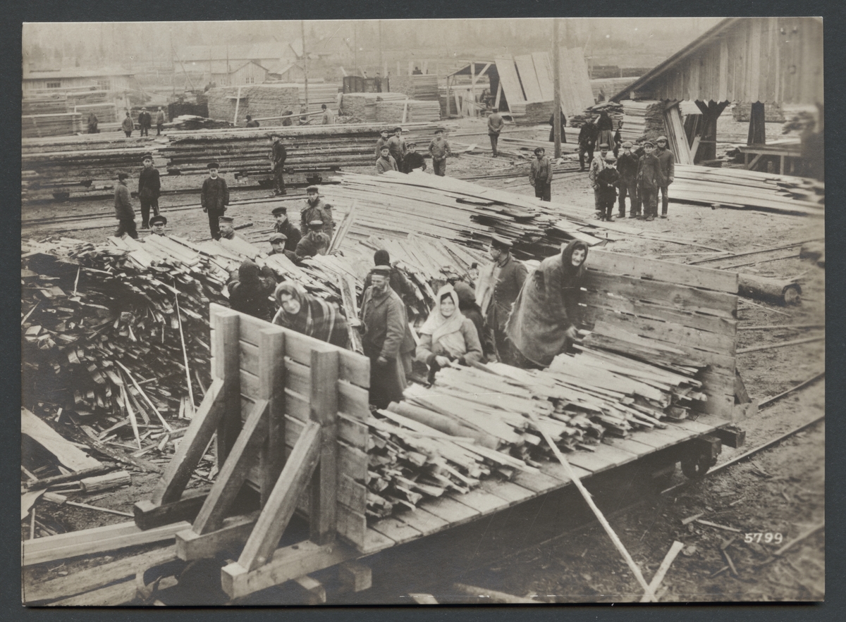 Bilden visar en lagringsplats för sågat trä. Flera arbetare håller på att lasta avfall och trärester på en godsvagn.