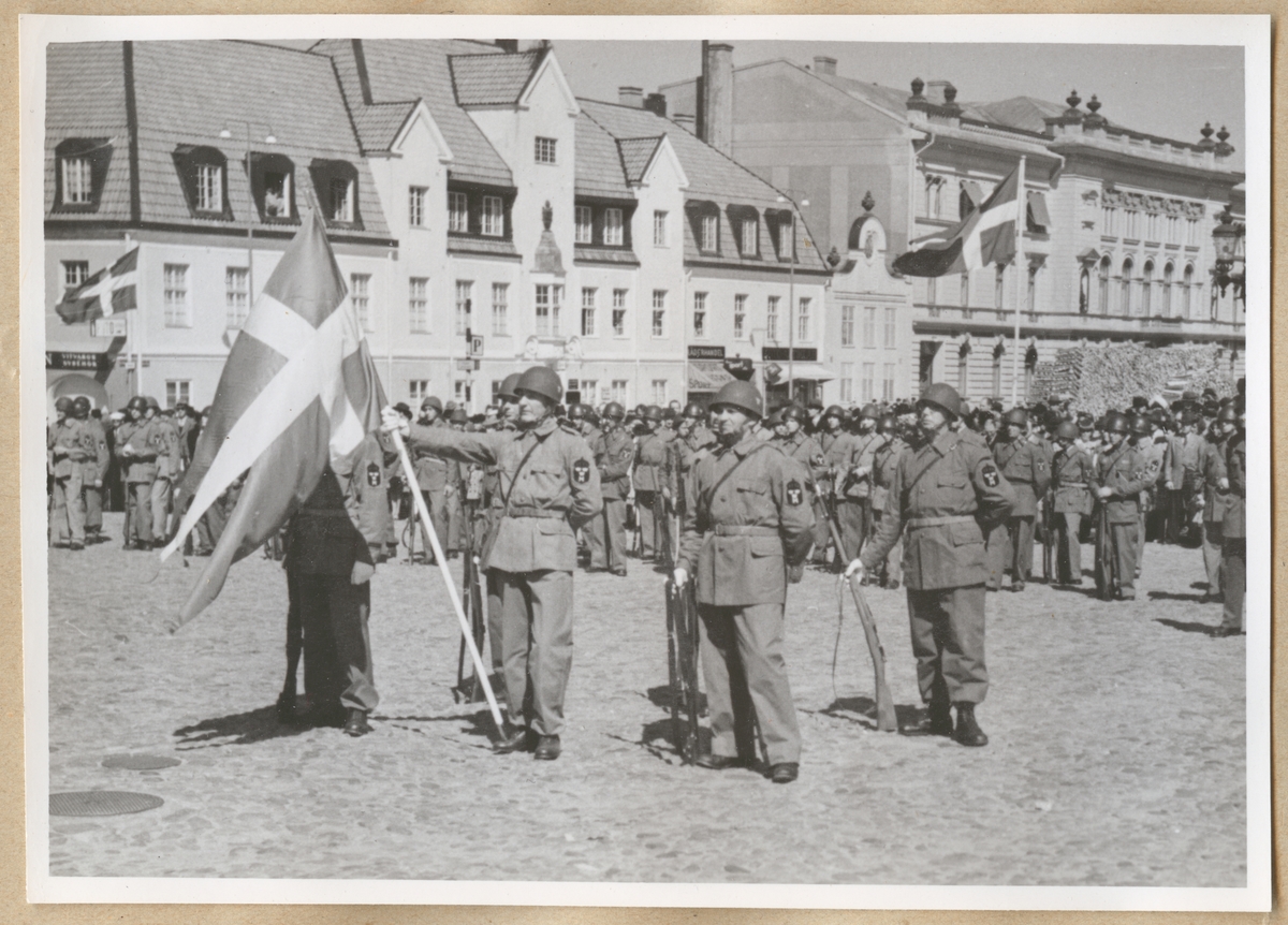En mindre grupp hemvärnssoldater står framför en större samling av hemvärnssoldater på stortorget. En av de främre soldaterna håller i en tretungad sverigeflagga. Soldaterna är beväpnade med gevär och bär uniform och hjälm. I bakgrunden skymtar stadshotellet och bankhuset.