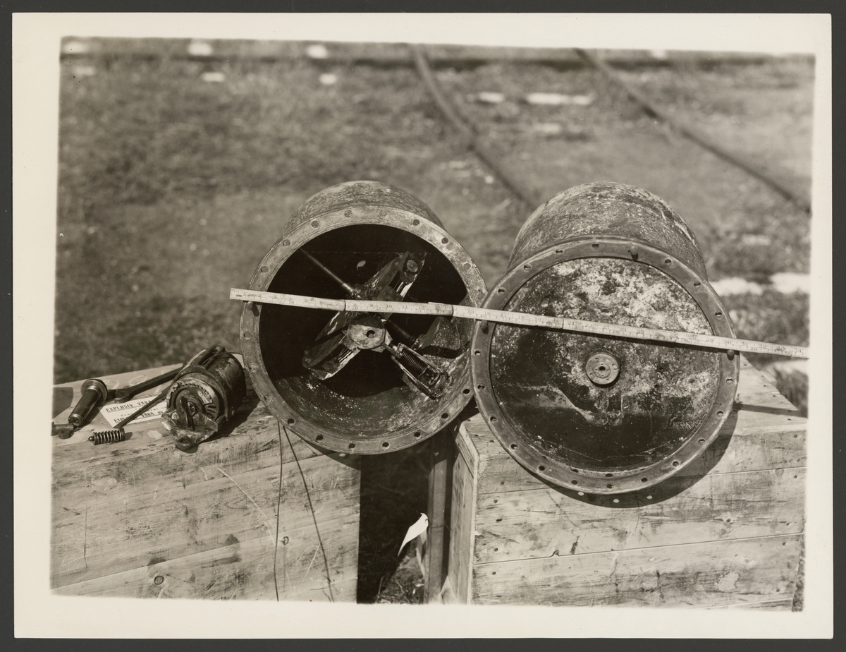 Titel: Bildserie som dokumenterar desarmeringen av en tysk tillverkad sjunkbomb som hittades 1936 vid Hasslö av besättningen från trålaren "Försten.