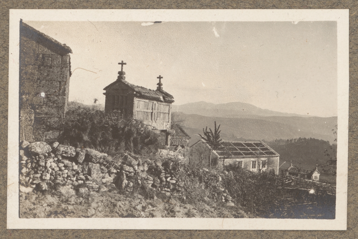 Bilden visar en by i ett bergslandskap. I bildens centrums syns en förrådsbyggnad som är försedd med två kors på taknocken.