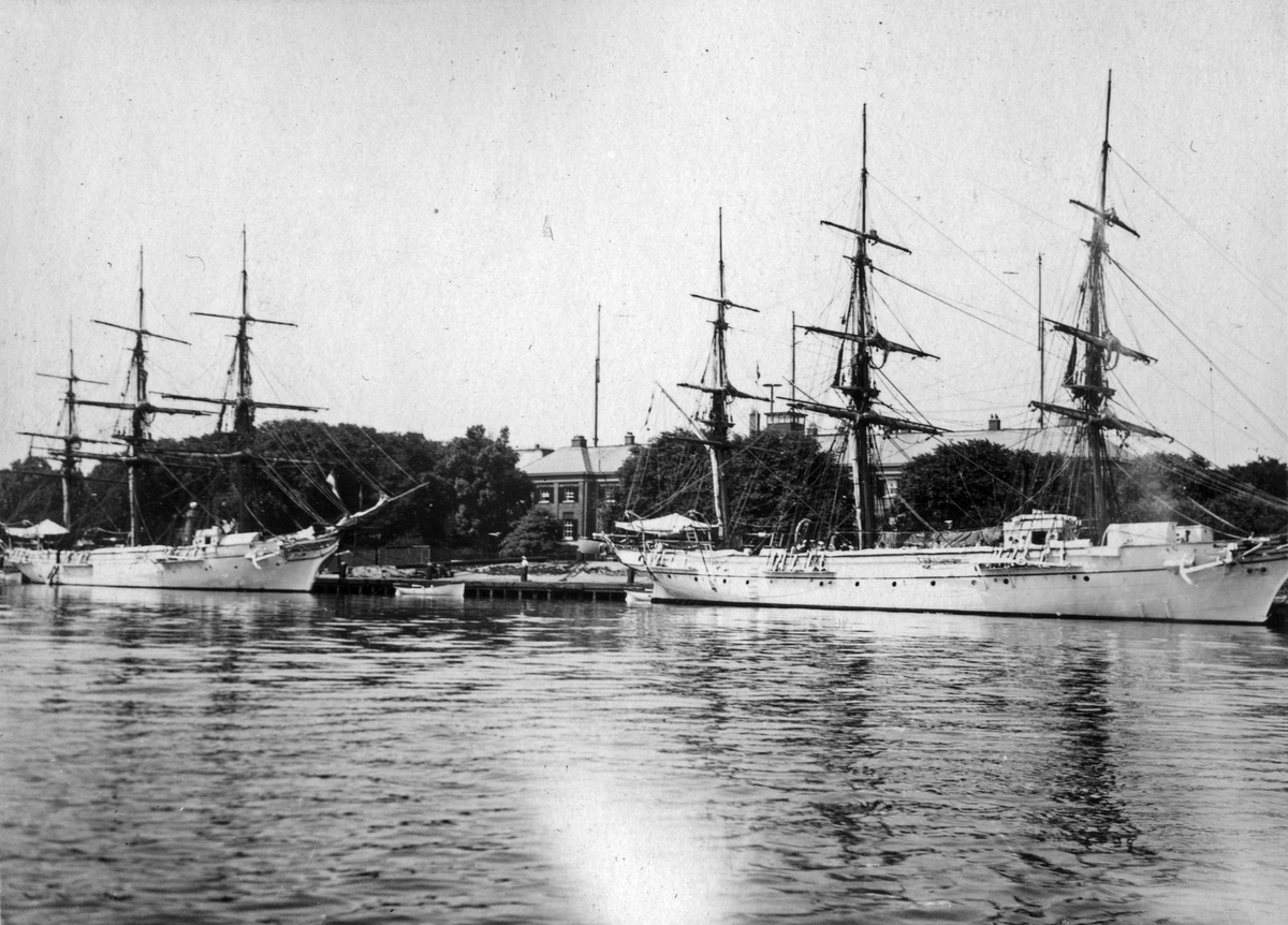 Titel: Najaden på resa till Holland. Ankrad i hamn i Helden omgiven av andra fartyg.
