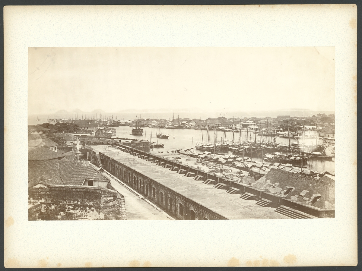 Bilden visar hamnen i Manila på Pasig floden. I förgrunden syns befästningsanläggningen Fort Santiago.