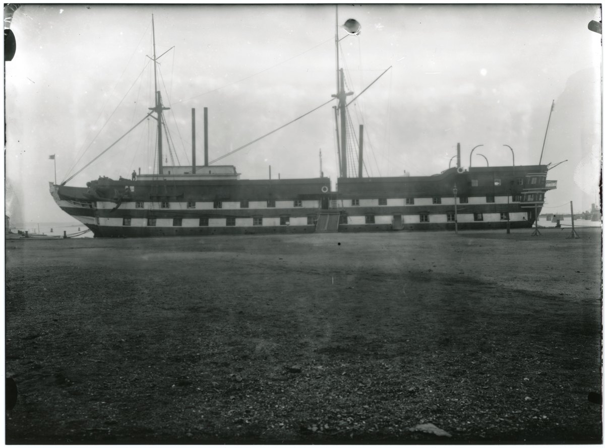 Fartyget ligger förtöjt utanför yttre örlogshamn, Karlskrona. Galjonsbild och akterspegelornament är intakta.