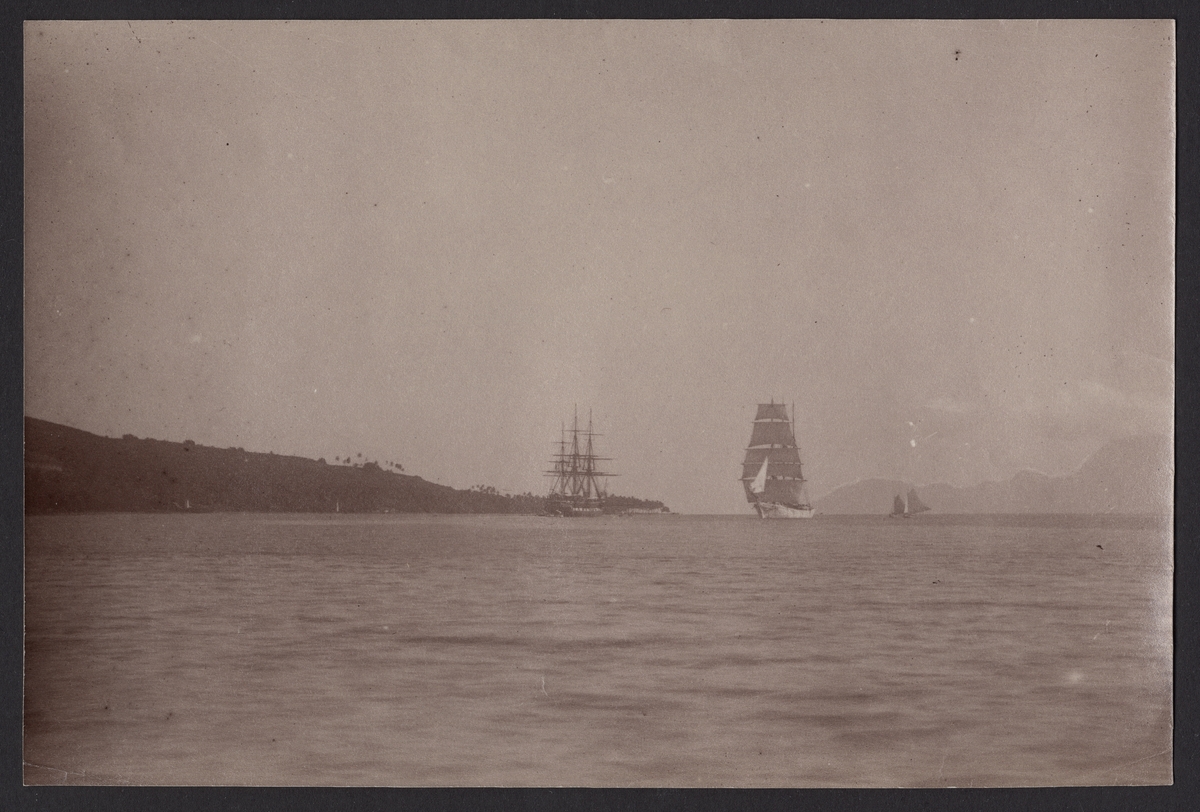 Bilden visar fregatten Vanadis till ankars utanför Tahiti. Bredvid henne syns två andra segelfartyg som har seglen satta.