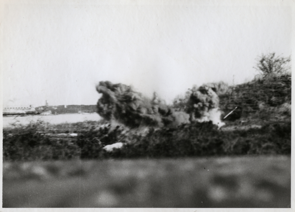 Titel: Tjock rök syns på gräskulle efter explosion. I bakgrunden syns en havet med ett fartyg.