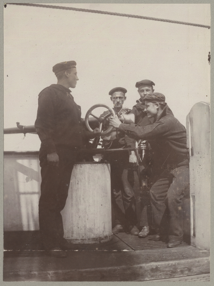 Fyra besättningsmän från Balder visar upp hanteringen av relingskanonen för fotografen. De två män i bakgrunden tittar rakt in kameran.