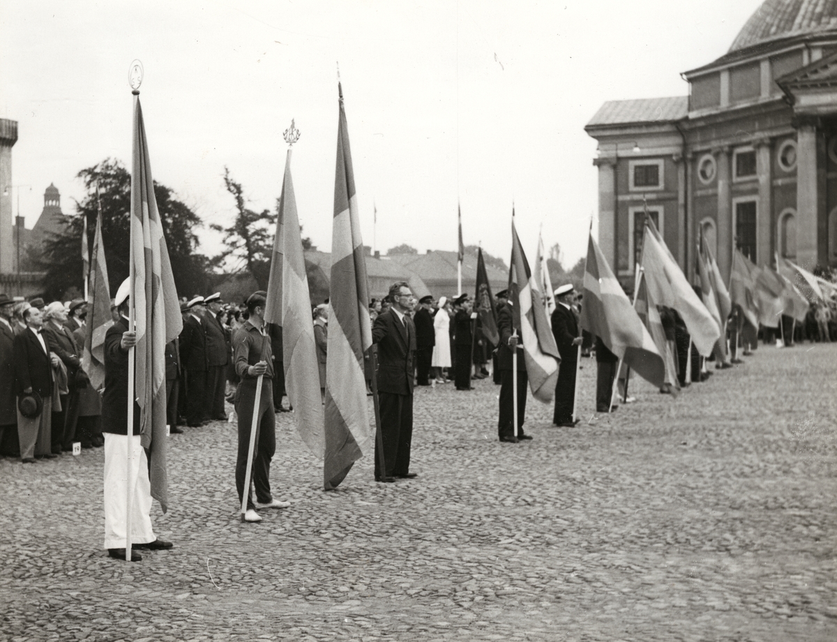 Titel: Fanbärare står på rad under cermoni på stortorget.