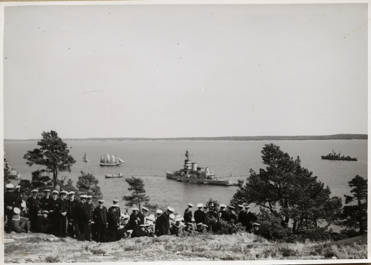 En stor grupp sjöbefäl och värnpliktiga står/sitter på klipphäll. I bakgrunden syns diverse fartyg, bl.a segelbåt och militärbåt utmed vattnet.