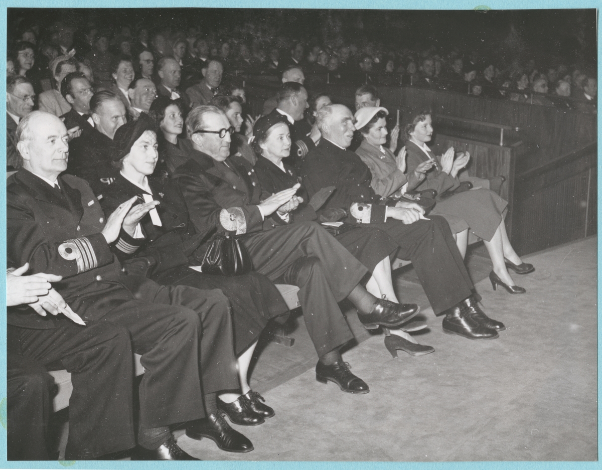 En publik applåderar i konsertlokalen i Karlskrona Konserthusteater. I raden längst fram mot gången sitter Konteramiral Samuelson (tredje fr. v.) och Vice Amiral Strömbäck (femte fr.v v.) med sina respektive. Runt dem finns även fler högre officerare.