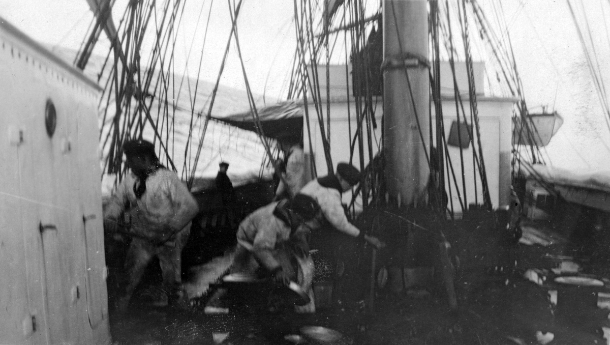 Titel: Unga gossar ur besättningen diskar/städar på båtsdäck.